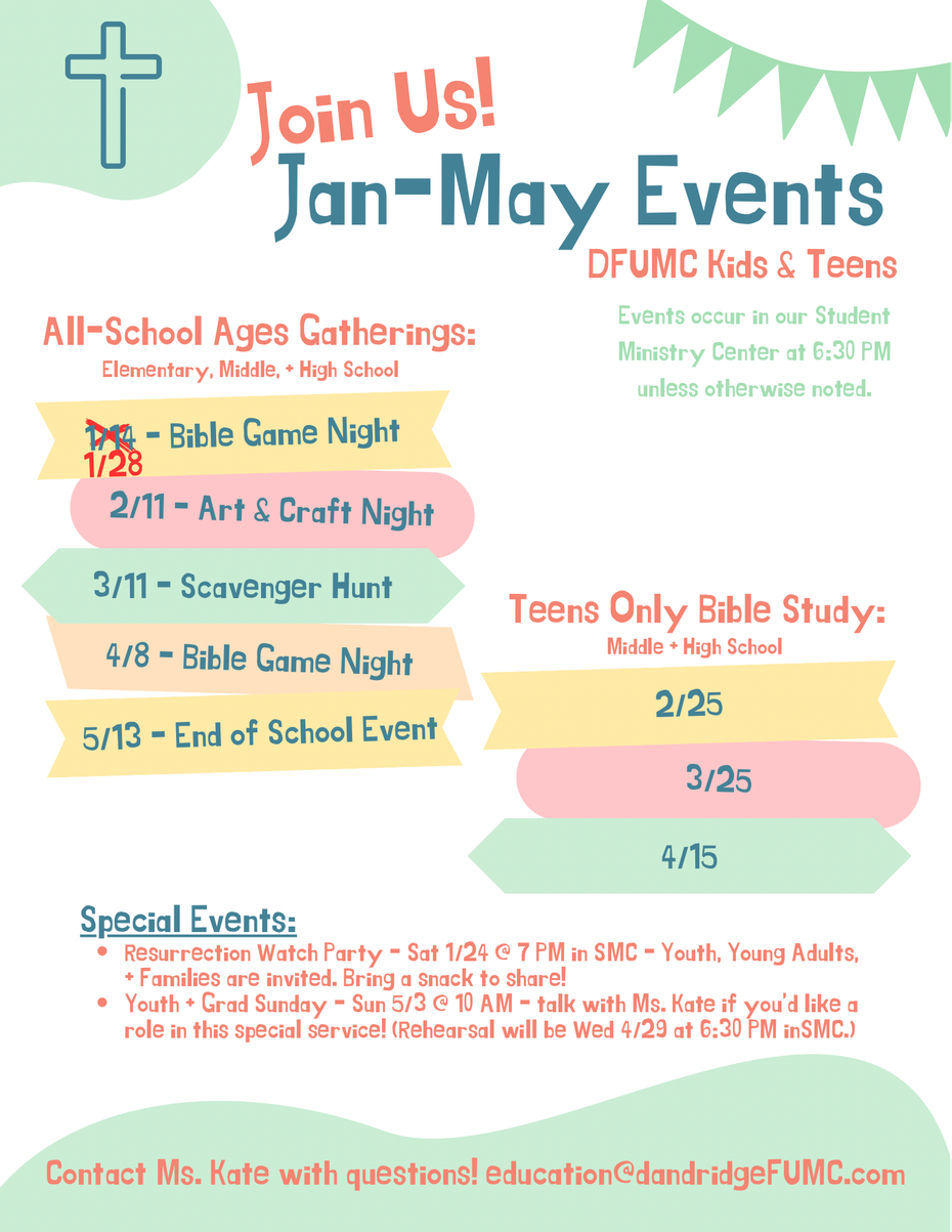 As of fall 2025, we have started offering multiple "all-school-aged ministry" events for children pre-K through high school to combine our youth and children's programs. These events are from 6:30-7:30 PM in the Student Ministry Center. Contact Ms. Kate for more info or to RSVP at education@dandridgeFUMC.com.
