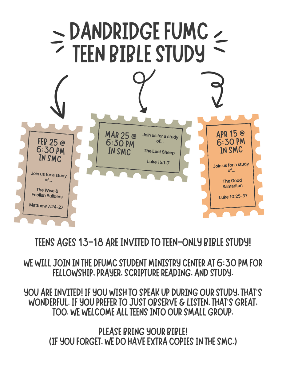 - Wed Feb 25 - 6:30 PM, SMC, TEEN Bible Study (middle + high school only)